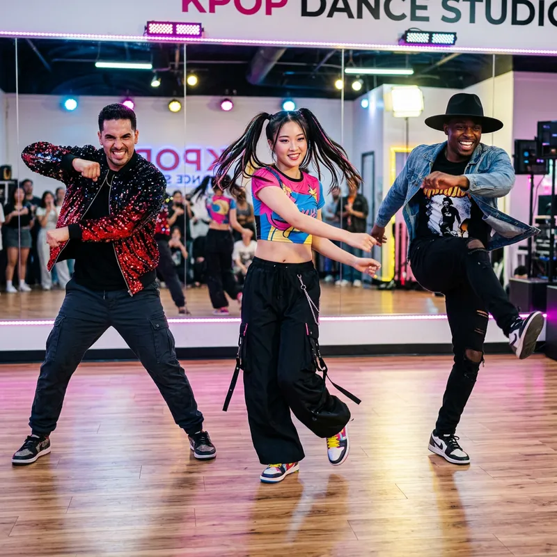 A detailed image of three professional dancers, each with their unique style. Dancer one is a Hispanic male in a flashy sequined jacket executing a sleek pop-and-lock move. Dancer two, an Asian female, showcases the fluid and graceful movements typical in Kpop choreography. She wears a vibrant outfit with wide-leg pants and a cropped top. The third dancer, a Black male, pulls off a high-energy spin with a stylish wide-brimmed hat completing his outfit. The mood is lively, and the background is a bright, well-lit dance studio, reflecting the vibrant energy of Kpop.