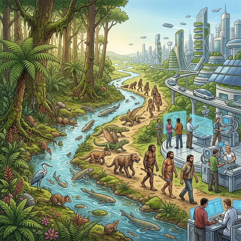 Visualize the concepts of survival, evolution, and revolution as a dynamic landscape. Begin with primal nature: lush, unspoiled forests filled with diverse flora and fauna, with clear rivers flowing through them. Transition to a depiction of evolution, showing a timeline of different species evolving, with a particular emphasis on the visible changes in their anatomy to adapt to their environments. Finally, represent revolution with an allegorical scene of upheaval and transformation in a society depicted as a thriving city on the horizon, with technology and advancements replacing primitive landscape. Note that no violence or conflict should be illustrated, but rather change and progression.