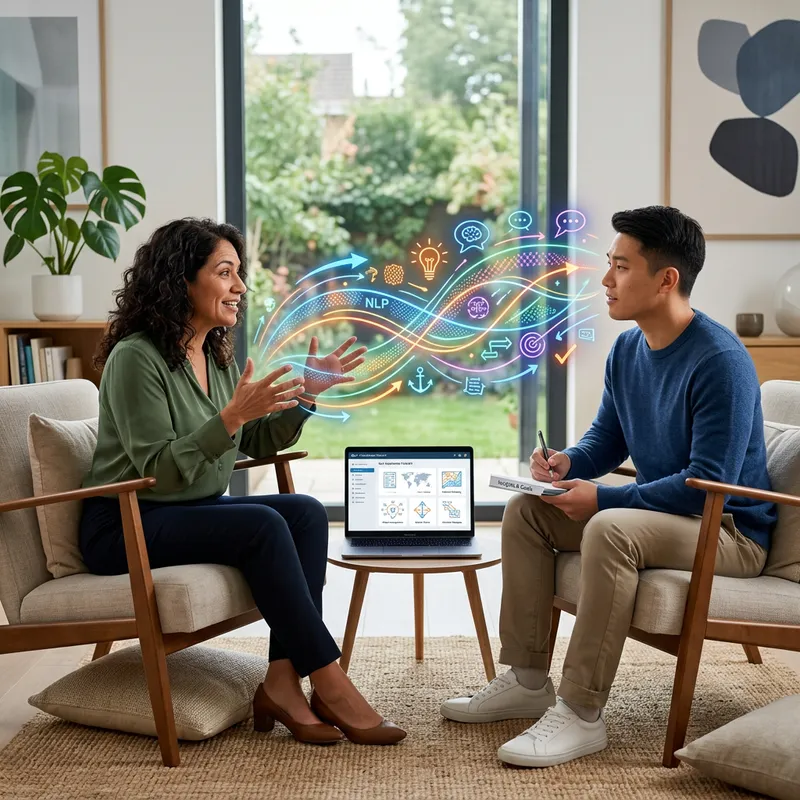 Depict a dynamic scene depicting life coaching. A middle-aged Hispanic female life coach is engaged in communication with a young Asian male client in a comfortable, relaxed setting. Position both of them in a room with modern minimalist interior design. The coach should be seen using gesturing hands as if conducting Neuro-Linguistic Programming techniques. Their intelligent and earnest conversation is visualized by colorful connecting lines or icons that symbolize the exchange of thoughts and ideas. Also, include a laptop with open Neuro-Linguistic Programming application to signify the use of technology in this process.