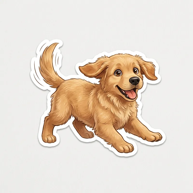 Create a sticker-like image featuring a playful dog that appears to have been cut out from the surrounding scene. The dog should have delightful features including soft fur, bright eyes, and a wagging tail. It should be in a dynamic pose, perhaps playfully crouching or jumping, and the sticker border should be clearly visible against a plain, light-colored background.