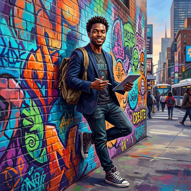 a dynamic portrait of a self-made entrepreneur in a urban setting, inspired by street graffiti, vibrant colors, confident pose, digital painting with bold brushstrokes, entrepreneurial spirit