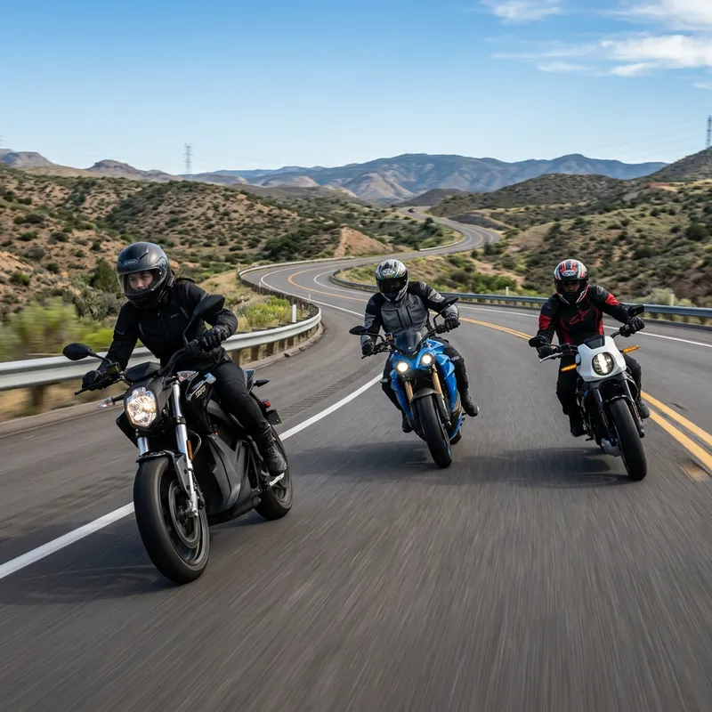A dynamic scene showcasing multiple electric motorcycles in action. The smooth and sleek motorcycles are speeding along an open highway, the backdrop filled with the view of distant hills beneath a clear blue sky. The riders, a diverse mix of Caucasian female, Black male, and Hispanic male, adorned in modern riding gear, seem completely absorbed in their journey. The bikes produce no exhaust, exemplifying the eco-friendly nature of electric vehicles. The road beneath is well-maintained and winds into the distance, encapsulating a sense of adventure and freedom.
