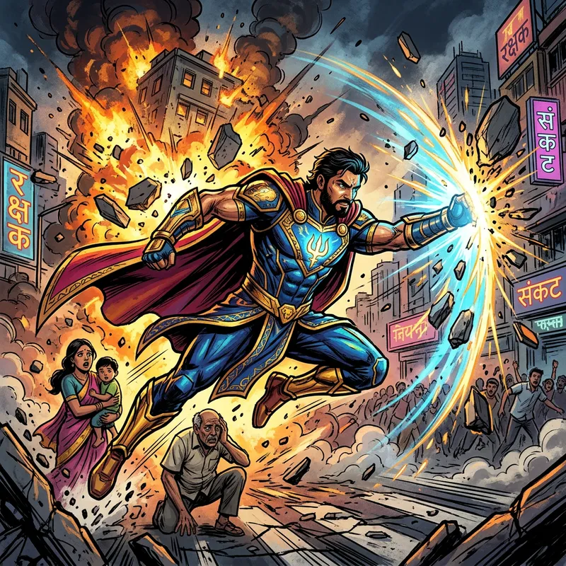 Depict a powerful superhero of South Asian descent in a dynamic action pose. The style should draw inspiration from comic books, using bold colours and thick outlines to capture the dramatic moment of protection. This digital painting should illuminate the vibrant brushstrokes that express the energetic and action-packed atmosphere of the superhero genre.