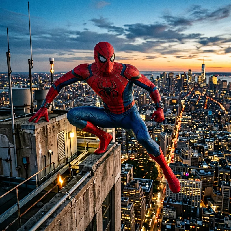 A superhero dressed in a vibrant red and blue costume, with a stylized arachnid emblem on his chest. His mask conceals his entire face and features white, lens-like eyes. The superhero stands in a dynamic pose on top of a city skyscraper, ready to leap into action, giving off the aura of defending the city from unseen threats.