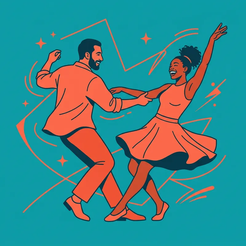 Create a vivid and lively image for a spring dance event flyer. The key object is a pair of dancers, possibly a Middle Eastern man partnered with a Black woman, captured in a dynamic dancing motion. Use a minimalist approach with two-tone solid colors, embodying the energy and synchrony of the dance. Exclude any elements of flowers. The style should emphasize a strong and active composition, making it ideal to promote the anticipation and excitement of the event. The medium of the illustration should be digital graphic design.