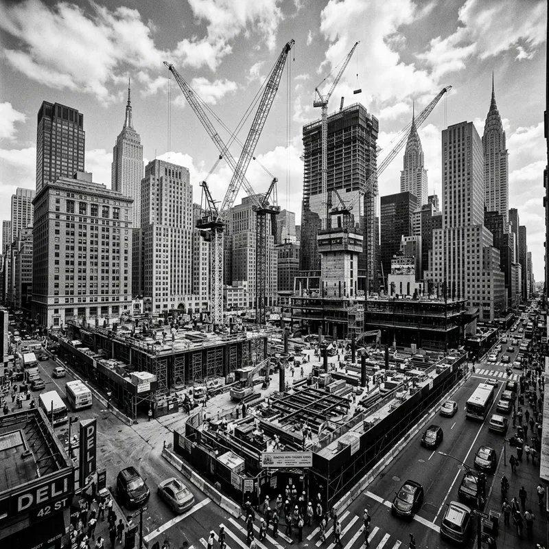 Capture a dynamic image of a bustling construction site situated in the midst of a vibrant cityscape. The scene should be captured using the perspective of a wide-angle lens to emphasize the extensive scope of the urban setup. The image should be presented in an urban documentary style, highlighting the hustle and bustle of the city underneath the towering structures. Render the image in high contrast, black and white, to pay homage to classic street photography aesthetics. The detailed city architecture should be prominent, reflecting both the modernity and tradition of the city.
