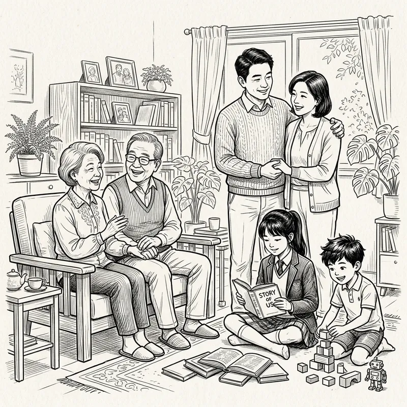 Create a detailed line sketch of a six-member East Asian family. The family should include grandparents, parents, a middle school-aged daughter, and an elementary school-aged son. The grandparents could be sitting together, sharing a light moment. The parents can be seen standing next to them holding hands, conveying a sense of unity and strength. The children should be portrayed as lively and curious – the daughter can be depicted reading a book, showing her love for learning, and the son can be seen playing with a toy, suggesting his playful nature. Render the overall atmosphere as warm and loving.