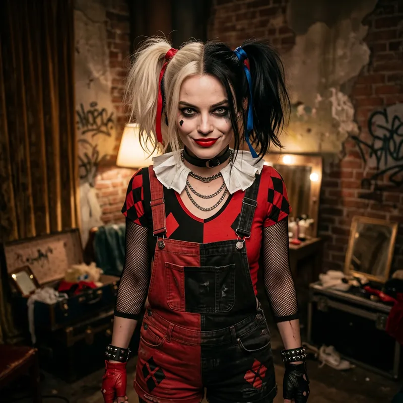 A woman with eccentric fashion sense and similar physique to a famous pop singer, dressed as a comic book character known for her jester-like outfit and pig-tail hairstyle, looks straight into the camera. She is embodying the reckless yet playful vibe of the character, her eyes ablaze with mischief and excitement. The background is a dimly lit room, adding to the dramatic effect of the scene.