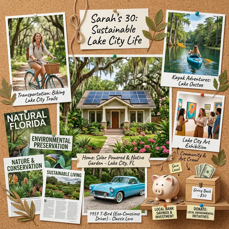 In a vision board format, illustrate a sustainable lifestyle in Lake City, Florida for an eco-conscious individual at 30. Picture a house equipped with solar panels, surrounded by lush greenery. Include a scene of biking or walking for transportation, reflecting the individual's commitment to environmentally friendly practices. Add magazines related to nature and environmental preservation, and a vintage 1957 Ford Thunderbird parked nearby as a nod to a classic car enthusiasm. Illustrate fun moments involving local art exhibitions and outdoor activities, a piggy bank to depict savings and investment in local banks, and a donation box indicating contributions to local environmental initiatives.