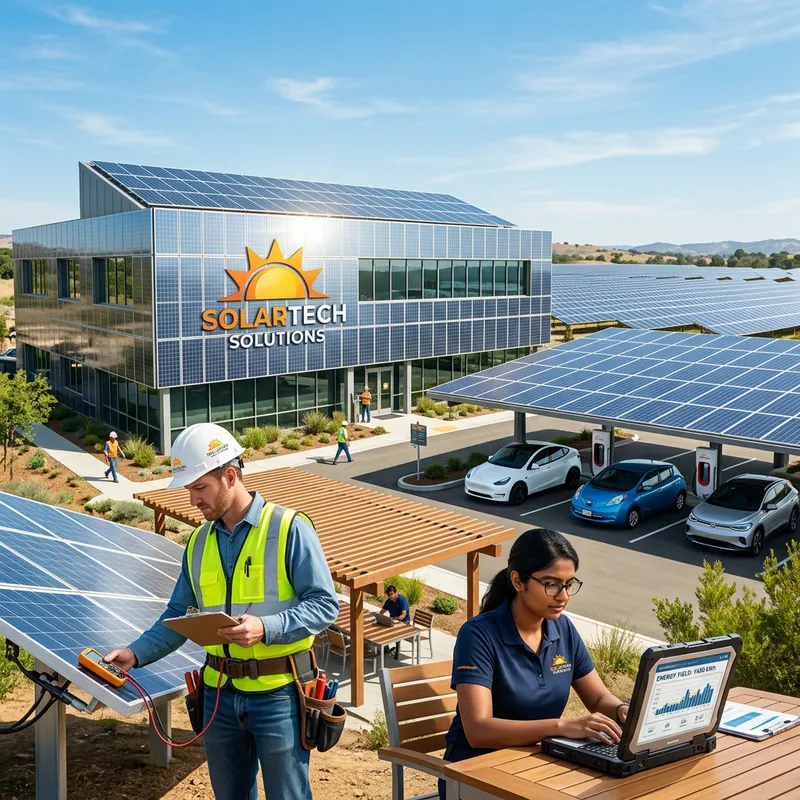 Portray an eco-friendly scenario showcasing a solar company in the middle of the work day on a sunny afternoon. The company's logo, a sun icon, is prominently displayed on the building. The building itself is modern in design, covered in shiny solar panels that reflect bright sunlight. A Caucasian male engineer is inspecting a solar panel outdoors. Nearby a South Asian female worker is using a laptop, busy with some computations. The company's carport, equipped with solar panels on top, shelters a few electric vehicles. In the backdrop, an infinite array of solar panels extends as far as the eye can see.