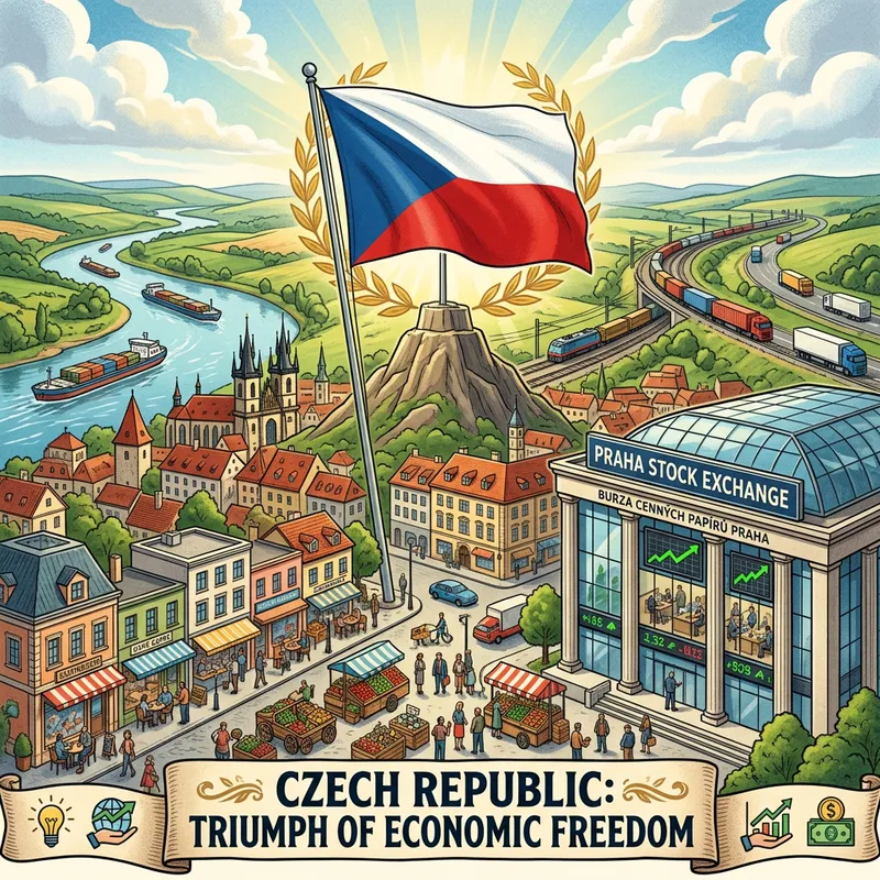 The concept of economic freedom represented with the Czech Republic as the victor. The setting features various elements of a thriving economy such as vibrant businesses, bustling stock markets, and thriving trade routes. The backdrop showcases the geographical terrain of the Czech Republic with its flag proudly central positioned as a testament to its economic achievement. All this embodied as a symbol of prosperity and progress denoting the Czech Republic's victory in the realm of economic advancement.