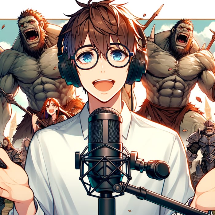 An anime-style illustration of a male video blogger with brown hair and glasses enthusiastically speaking about a popular fantasy series involving giants