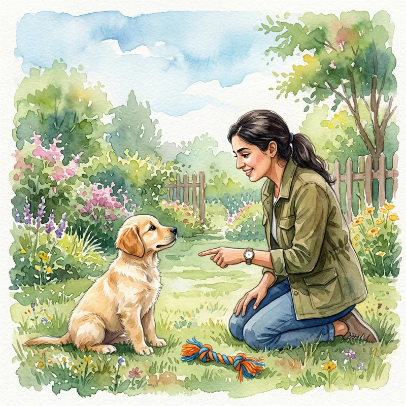 A scene depicting the education of a young puppy. The puppy is sitting attentively, listening to the instructions given by its trainer. The trainer, a middle-eastern female with a kind gaze, is pointing towards a dog toy suggesting a retrieval exercise. The puppy is eager, its body language showing readiness for a fun session of learning. The whole setting is peaceful with an outdoor background featuring a lush green garden under a serene sky. Render this scene in the style of a watercolor painting, capturing the softness and fluidity of watercolor artistry.