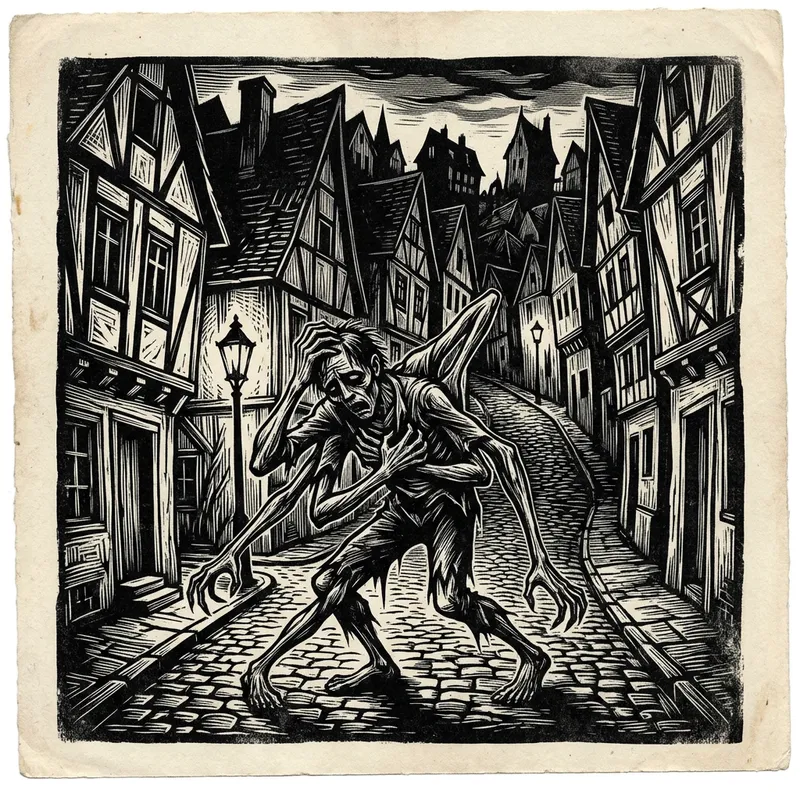 A horrendously wretched creature with multiple appendages in agony, depicted in a manner reminiscent of the obscure, foreboding aesthetic associated with the early 20th century expressionist movement. This creature is portrayed in a setting that captures the eerie tranquillity of a hushed hill town.