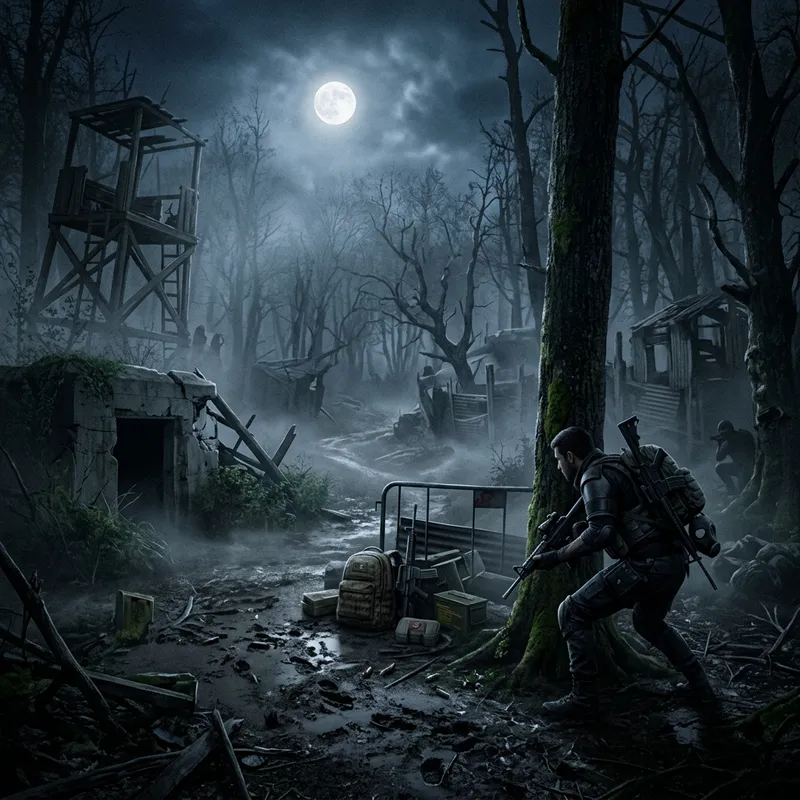 Eerie Free Fire Scene with Misty Forest and Abandoned Structures