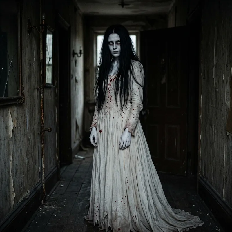 A chilling figure stands in the darkness. The mysterious entity is characterized by her long, flowing straight black hair and stark white skin, creating an eerie contrast against the obscure surroundings. Her eyes, void of color showcase a stark white hue that amplifies the suspense in the scene. She is adorned in a ghostly long white dress that seems to blend in with her skin. Spots of red blood are splattered along the dress and around her, adding a horrifying element to the otherwise ghostly scene. The figure radiates a reactionary and intimidating aura.