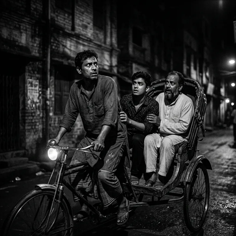 Three South Asian men on a cycle rickshaw during a dark night. The scene is captured in a low-key lighting style with dramatic shadows. Their faces carry expressions of fear and show intense responses to an unseen threat. The image seems to be taken with a vintage film camera, adding to the eerie atmosphere. The overall mood of the image aligns with the horror genre.