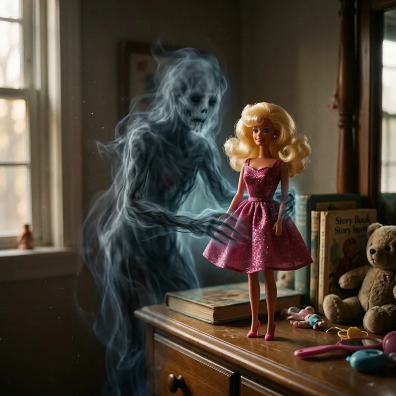 An image showing an eerie spectral entity having a characteristic nebulous face, standing menacingly near a classic, popular fashion doll with blonde hair, wearing a pink dress.