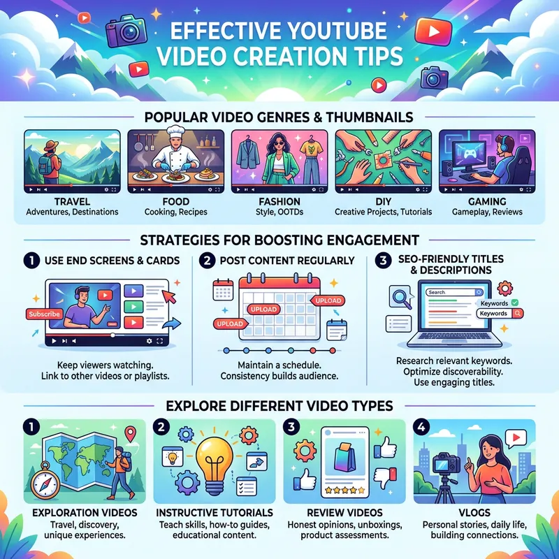 A creative collection of infographics demonstrating effective YouTube video creation tips. These infographics should include colorful thumbnails displaying various genres of content - travel, food, fashion, DIY, gaming. They also should illustrate strategies for boosting engagement such as including end screens and cards, regularly posting content, and using SEO friendly titles and descriptions. Also, showcase different types of content for YouTube such as exploration videos, instructive tutorials, review videos, and vlogs. Please, place these components against a bright, motivating background.
