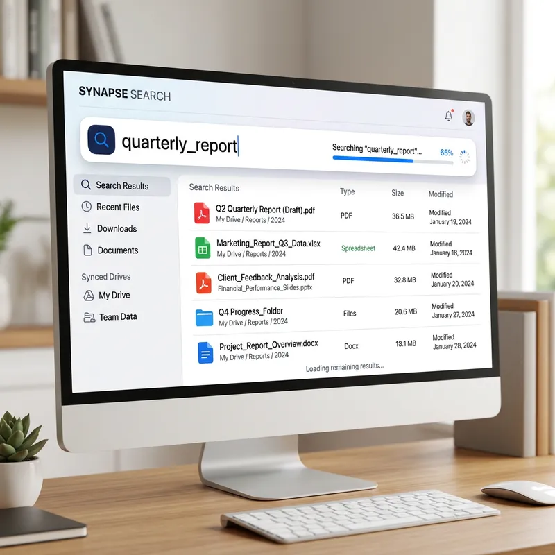 Visual representation of a contemporary, efficient, file search system. The image should depict a digital interface with organized files, folders, and a search bar. Key elements to include: a search magnifier icon, various file and folder icons of different colors, and a progress bar indicating the search process. The overall aesthetic should be sleek, simple, and easy on the eye, akin to modern design standards.