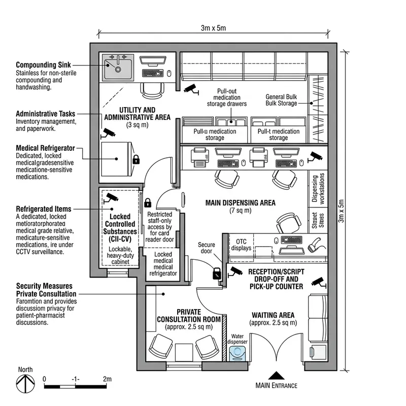 Design a small but efficient hospital pharmacy floor plan within a space of 15 square meters. Include the following features: a reception or entrance where patients engage with pharmacy staff and drop off/pick up prescriptions, a dispensing area with workstations, computers, and medication storage, distinct storage spaces for different types of medications and their specific storage needs, private consultation rooms for patient-pharmacist discussions, a waiting area for patients waiting for their prescriptions or consultations, areas designated for administrative tasks like paperwork and staff meetings, utility rooms housing various equipment like compounding sinks and refrigerators, and incorporate security measures to ensure medication safety and adhere to necessary regulations.