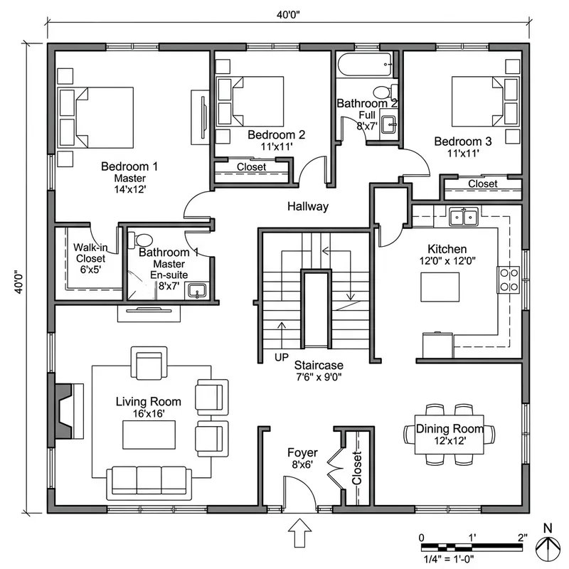 Square House Floor Plan with Three Bedrooms and Convenient Staircase