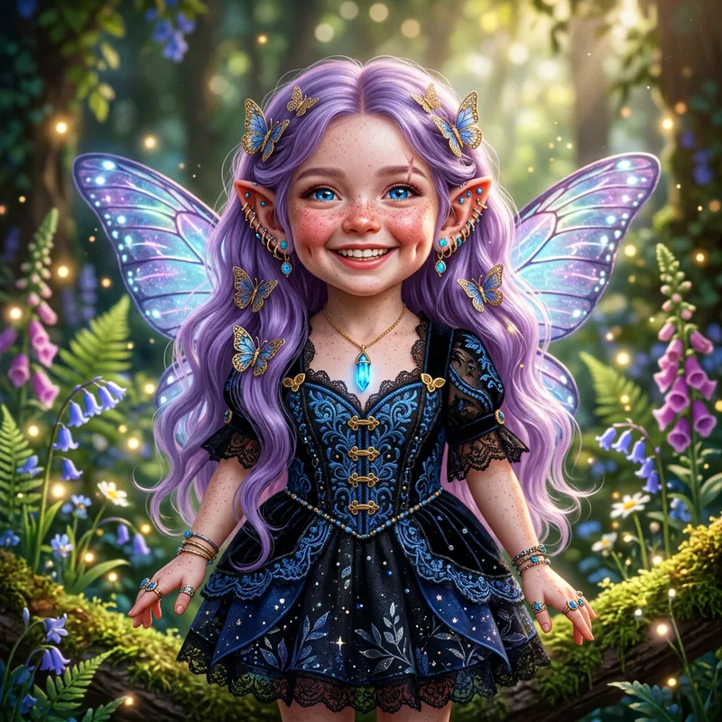 A small fairy with long wavy purple hair. She wears small butterfly hair clips. Her eyes are crystal blue. She has freckles on her reddish cheeks and dimples when she grins. There is a small scar on her left eyebrow that has healed. She wears a gold necklace with a blue crystal around her neck. She has many rings and studs on her ears. Her outfit is predominantly black with blue details.