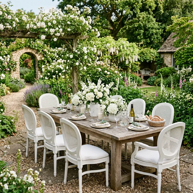 Example of garden setup with wooden table and white Versailles chairs, white flowers.