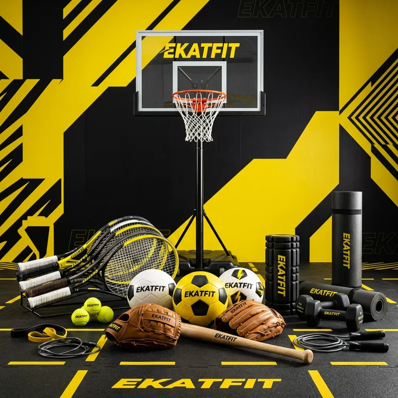 A collection of sports equipment, such as soccer balls, baseball gloves, tennis racquets, and basketball hoops, in a layout displaying the theme 'Ekatfit'. These items are displayed against a stark black and yellow background giving a lively contrast. The word 'Ekatfit' is prominently seen on the items or subtly incorporated into the design. The arrangement plays with depth, shadows, and highlights, enhancing the aesthetic appeal.