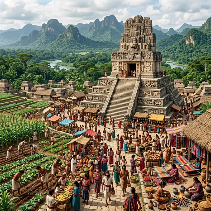 Discover a Vibrant Pre-Columbian Scene with Stone Temple and Marketplace