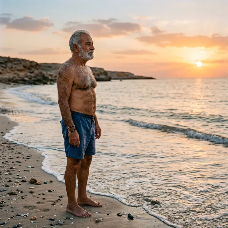 An elderly man of Middle-Eastern descent is on a beach. He is shirtless and his body is thick with hair. The man's face is lined with wrinkles, and his eyes are filled with stories and wisdom. The sea splashes gently at the shore, and the setting sun casts a warm, golden light. The beach is serene and empty, scattered with pebbles and seashells. The man seems to enjoy the tranquility away from the crowded city life, contemplating life as he gazes into the distance. His body exudes strength and resilience - a testament of his life's journey.