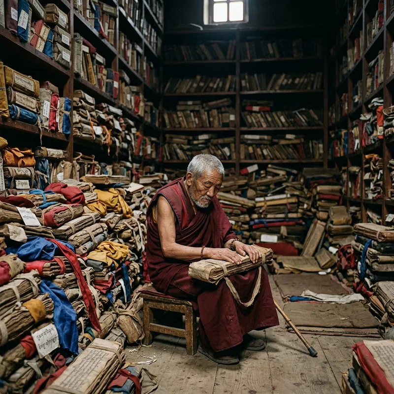 An elderly blind man despondently sitting amidst a gigantic treasure of Buddhist scriptures.