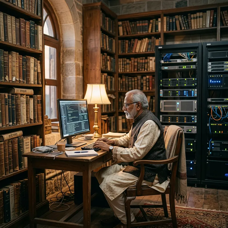 An elderly South Asian man, dressed in traditional attire, immersed in his work on a computer in a room rich with history. Around him are ancient, weathered books and technologically advanced servers humming with data. The atmospheric lighting subtly adding a warm glow, reflecting his dedication and the warm aura of knowledge that surrounds him. The juxtaposition of the age-old books and the state-of-the-art servers paint a fascinating picture of the blend of antiquity and modernity.