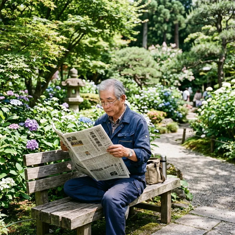 An elderly Japanese man, dressed in blue collar work clothes, is engrossed in reading a newspaper. He is comfortably seated on a bench in a lush garden park filled with blooming flowers and mature trees. The area is serene, with the scent of nature filling the air. The sun is shining gently, casting a soft glow on the scene.