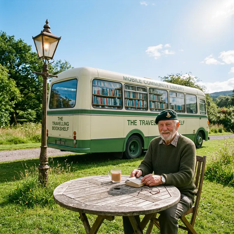 An elderly man wearing a green beret sitting at a round table in front of a bus that is situated behind him. The reflection in the bus window reveals bookshelves inside the bus. Surrounding this scene is grass, with a lamppost illuminating the elderly man. Overhead is a clear sky with very few clouds as well as the sun.