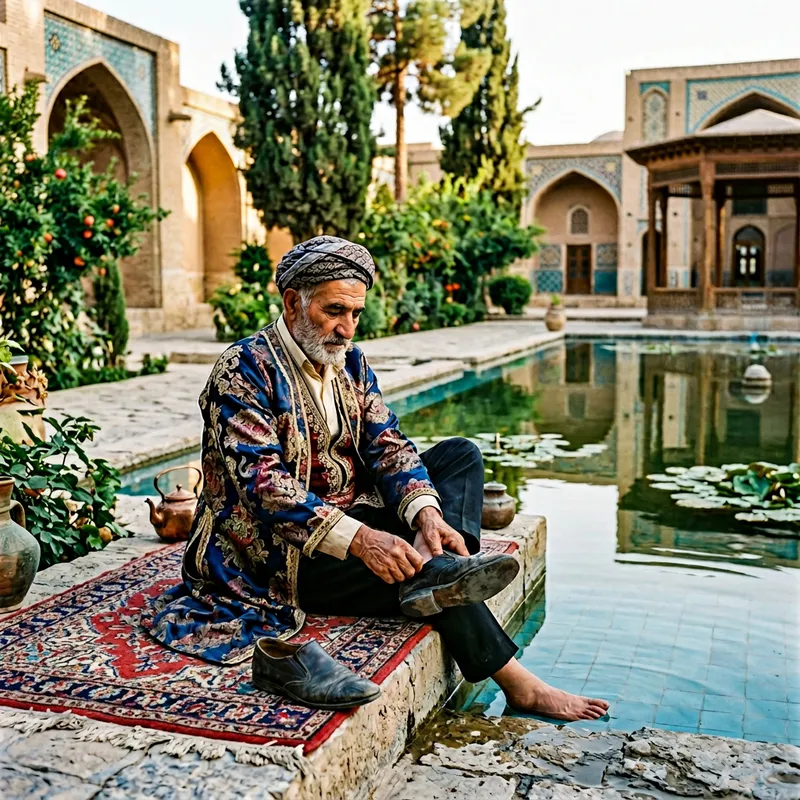 An elderly Middle-Eastern man dressed in luxurious traditional attire sits beside a serene pond, his posture refined as he gently removes his leather shoes. The scene resonates with the historic charm of ancient Iran, calling to mind the intricate artistry of Persian miniatures. Subdued, warm lighting illuminates the vibrant hues of his clothes, lending the atmosphere an old-world elegance. Captured in a detailed, narrative style akin to that of classic photojournalists, his calm demeanor permeates the image, introducing a layer of thoughtful introspection. Taken with a medium format camera, the image accentuates fine details and textures, portraying the finesse and majesty of the scene. The seamless blend of traditional and modern attributes conveys an enchanting visual narrative that transports the observer into the enchanting realm of ancient Iran.