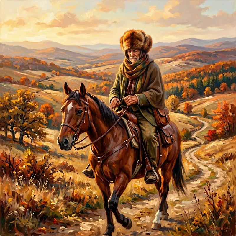 An elderly woman is seen riding on a horse in vast, undulating terrain, painted with the strokes and hue of a warm, early autumn afternoon. Unexpectedly, it is revealed that it is an old man in a hat made of squirrel fur. The unusual hat has a rich chestnut color and fluffy texture, contrasting with the man's wrinkled, weather-beaten face.