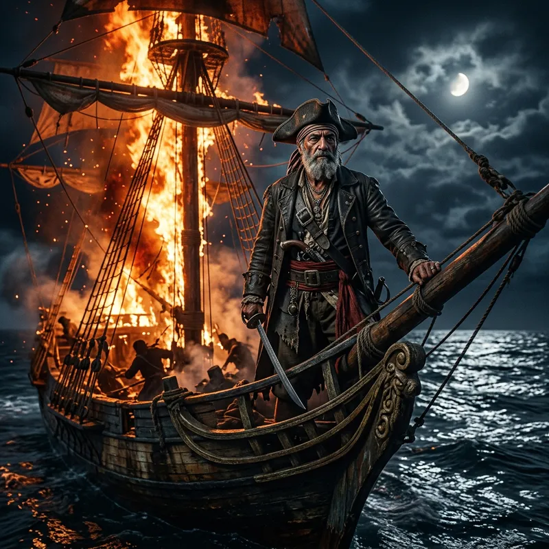 Elderly Middle-Eastern Pirate Captain on Ablaze Ship