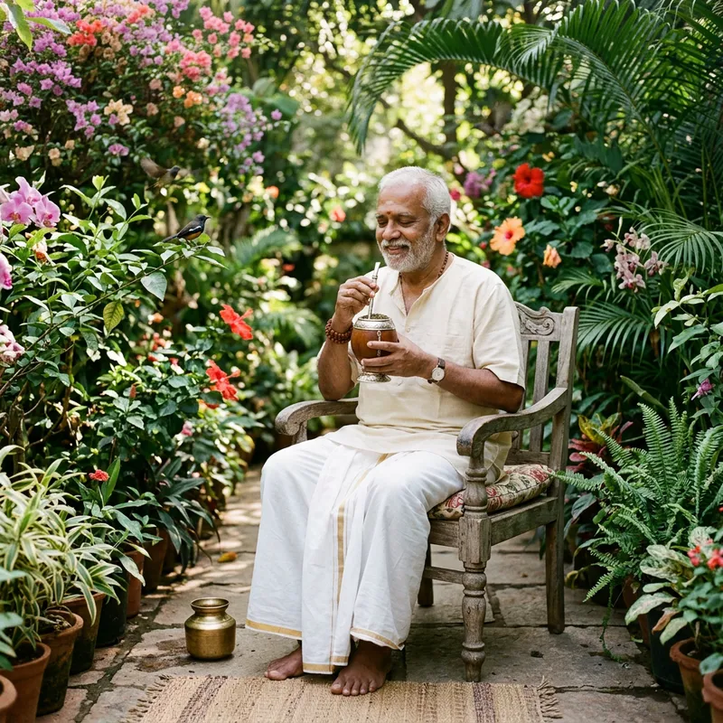 An elderly South Asian man in traditional clothing, sitting comfortably in a lush garden. He is holding a traditional gourd in one hand, and a silver straw in the other. He's sipping yerba mate with a serene expression, surrounded by flowering plants and the sound of birdsong.