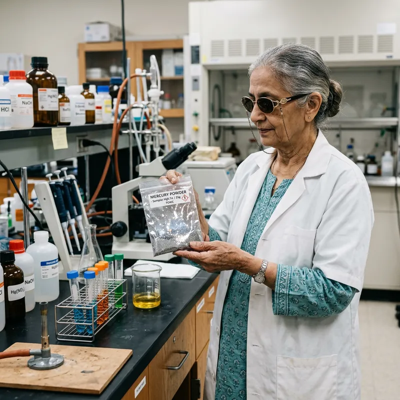 An elderly woman of South Asian descent with interesting sunglasses is standing near a laboratory table. In her frail yet steady hands, she holds a transparent, rectangular packet filled with greyish-silver powder, signifying that it could be mercury powder. The light reflects off tiny particles creating a sparkling scene. She is surrounded by the sterile, organized chaos of a laboratory. The bench around her is crowded with test tubes, beakers filled with colorful liquids, and various scientific apparatus.