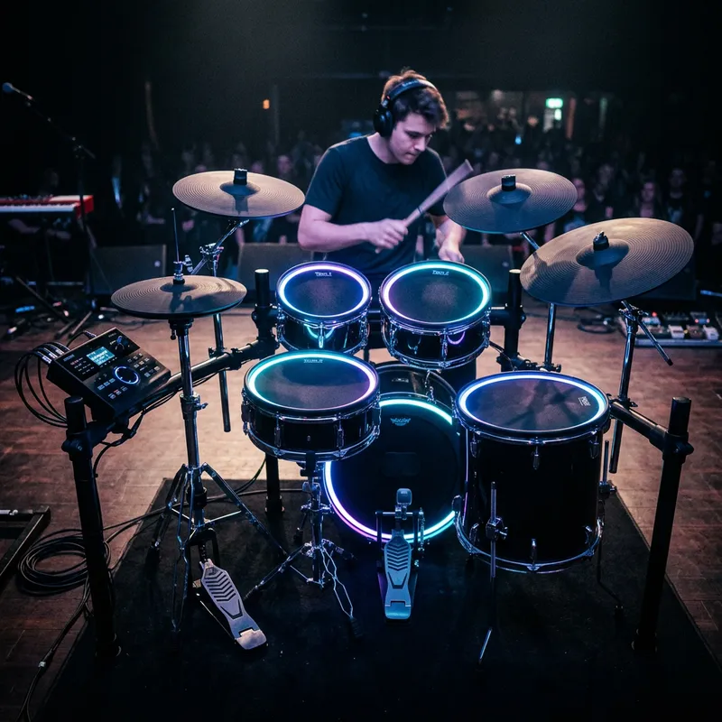 Imagine a modern electric drum set. The kit includes various elements such as a snare, tom-tom drums, a hi-hat, a ride cymbal, a crash cymbal, and a bass drum with a foot-operated pedal. The drums are connected to an electronic module, allowing them to produce a variety of sounds. The drumming pads have a black mesh material, and the cymbals are made of durable plastic, all mounted on an aluminium stand. The overall look of the set is sleek and modern. LED lights emit a soft glow, creating a dynamic aesthetic when played in darker settings.