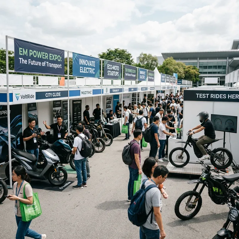 A bustling fair dedicated to the entrepreneurship of electric motorcycles. Various stalls display innovative designs of electric motorcycles with entrepreneurs eagerly demonstrating their machines. The atmosphere is vibrant with numerous visitors keen to discover and learn about the future of transport. The exhibits range from sleek city commuter bikes to robust off-road motorcycles, all powered by electricity. A few booths offer interactive demos enabling people to experience the power and efficiency of these eco-friendly machines. No specific human individuals are depicted, preserving a focus on the machines and the entrepreneurial spirit.