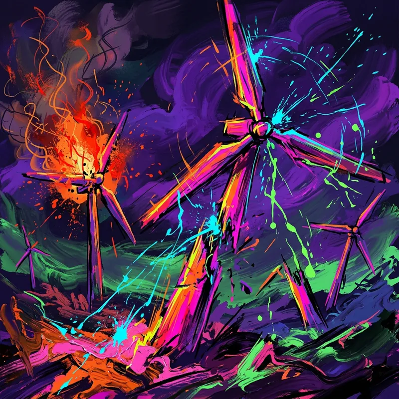 An abstract representation of disasters involving electric windmills, depicted with vivid neon hues and forceful brushwork that underlines the chaotic and deleterious events. The work combines elements of digital painting, reminiscent of the early 20th-century avant-garde movement, with the spontaneous splashes of fluorescent ink. This mixed media approach manages to capture the fervor and turbulence associated with such catastrophes.