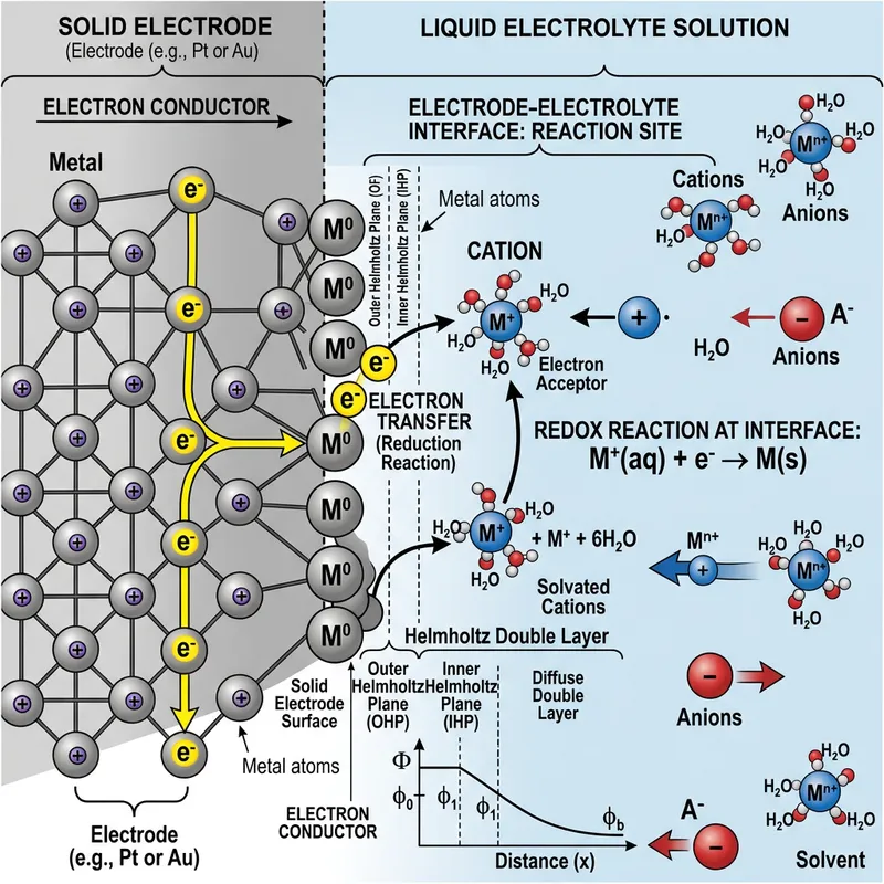 Illustrate a detailed scientific image showcasing an electrode and electrolyte interface. The interface should comprise the electrode which is a solid material through which the electricity enters or leaves an electrolyte in a solution. Please include focus on the reaction site where the flow of electrons are passed from the electrode to the electrolyte.