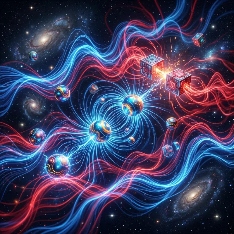 An abstract design imbued with the concept of electromagnetic materials. Visualize wave-like patterns signifying electric and magnetic fields. The colors are vibrant, featuring predominant blues and reds to illustrate the frequency of electromagnetic waves. There could be spheres and cubes representing different materials, some attracting and some repelling each other, simulating electromagnetism. The 3D objects float in a spatial, starry background to create a sense of cosmic atmosphere, abstract yet filled with the charm of science and technology.
