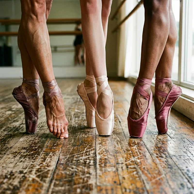 Close up view of ballerina's feet laced with satin ballet shoes. The older lady, of Hispanic descent, shows strong, muscular feet reflecting years of practice. Another pair, belonging to a young Caucasian female, displays sleek and nimble toes, evident of her recent entrance in the graceful world of ballet. The third pair owned by a middle-aged Black woman, display arches etched with permanence from her arduous yet satisfying journey in ballet. The wooden floor beneath is etched with marks telling the age and history of dancing pursuits happened here. Light-play from the nearby window create a serene ambience around them.