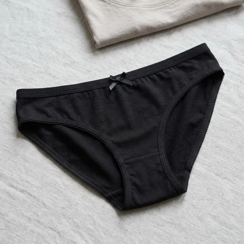 A functional piece of underwear, particularly a pair of panties, colored black. This staple in women's clothing is crafted from comfortable and breathable fabric, adding an air of sophistication and practicality. The black color evokes a sense of elegance while the design balances comfort and style.