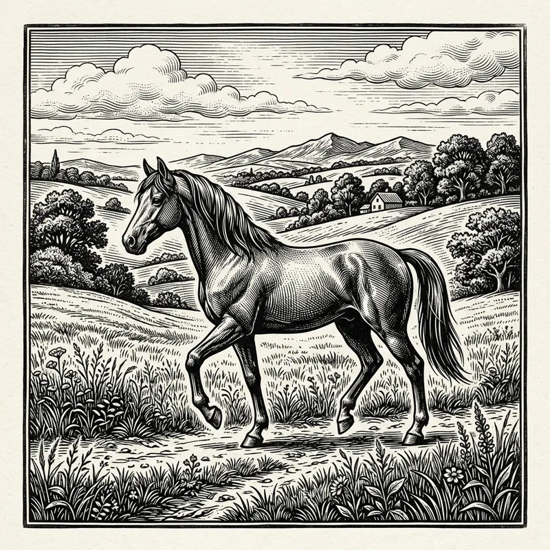 Imagine a tranquil scene on the grassland where a single horse is strolling leisurely. The horse should appear realistic and detailed, reflecting the horse's anatomy and elegance in a sophisticated manner. The entire image is to be imagined in black and white hues, giving it a classic and timeless feel. The style of the art is reminiscent of vintage woodcut engravings, with bold and sophisticated lines carving out the scene. This peaceful and classic scene should be designed to fit on a t-shirt, with every element of the design reflecting an ambiance of serenity and detailed craftsmanship. The image composition is literal, fitting the image size perfectly.