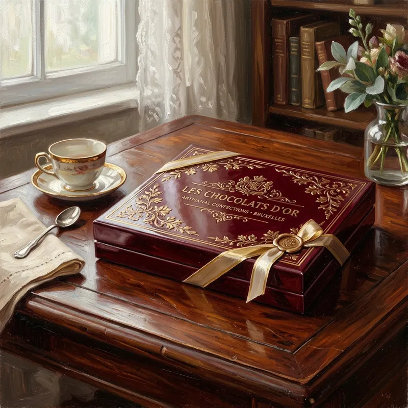 Illustrate an oil painting depicting a closed box of chocolates. The box is elegant, with a shiny surface reflecting soft hues. Sitting on a mahogany wooden table, the box exhibits an intricate design embossed on its cover. The surrounding is calm and quiet, evoking a sense of anticipation for the sweet treats contained within the box.
