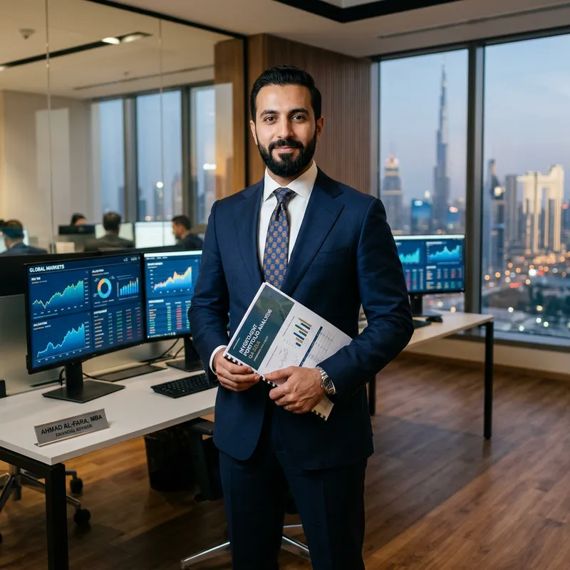 An elegant financial advisor in his 30s, of Middle-Eastern descent, dressed in a well-tailored suit. He's standing in a modern office with financial charts on the computer monitors. His expression is focused and confident, reflecting his professionalism. In his hands, he holds a financial report.